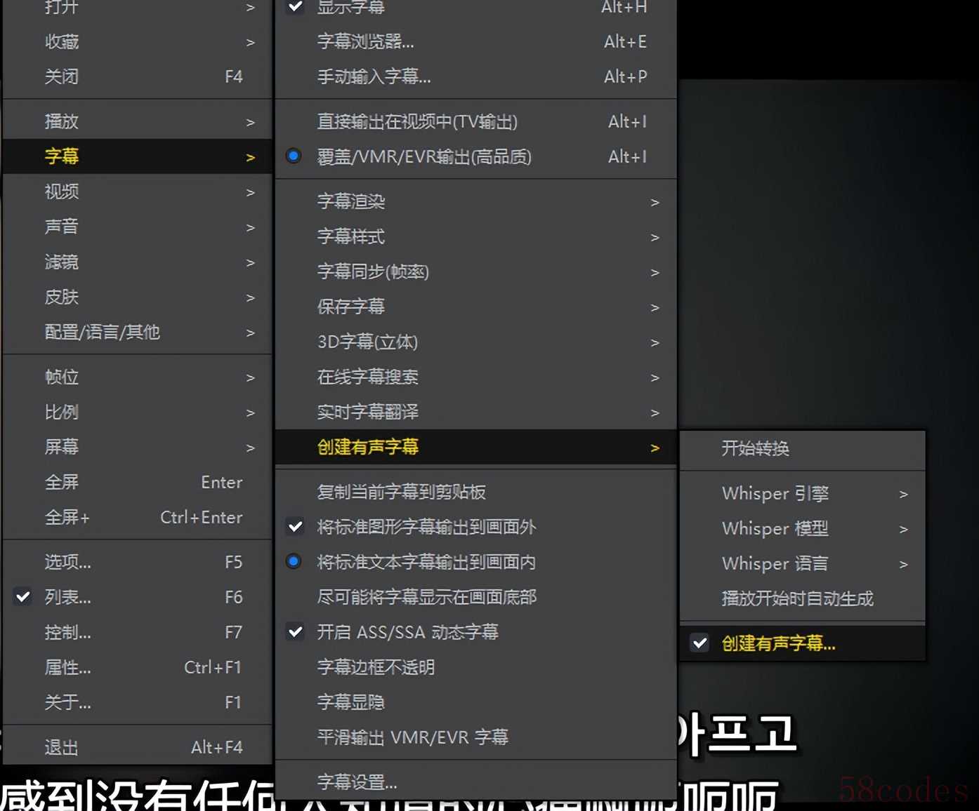 3、测试,播放无字幕的视频,点击窗口→选择字幕→创建有声字幕→创建有声字幕设置,点击开始,会自动读取视频的语言开始转换。