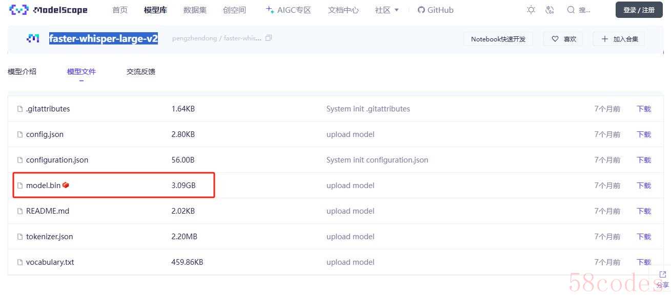 https://modelscope.cn/models/angelala00/faster-whisper-small/files进行下载,需要下载的文件有:config.json、model.bin、tokenizer.json、vocabulary.txt就这4个文件就行,其余不用下载。如果你的电脑性能不错可以下载其他模型,网址: