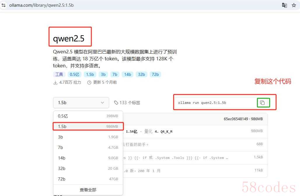 6、下载翻译模型,前往Ollama官网,选则Models,下载相应的模型,本次以qwen2.5版本为例,搜索qwen2.5,打开的界面选择需要的模型,本文测试,所以使用wen2.5:1.5b的模型,其他模型相对较大,对电脑消耗也比较大,1.5b大小986MB,选中后点击右侧的复制按钮,复制ollama run qwen2.5:1.5b这个代码,进入到刚才的CMD运行窗口,复制这段代码,开始自动下载模型,需要其他的方法都是一样的。