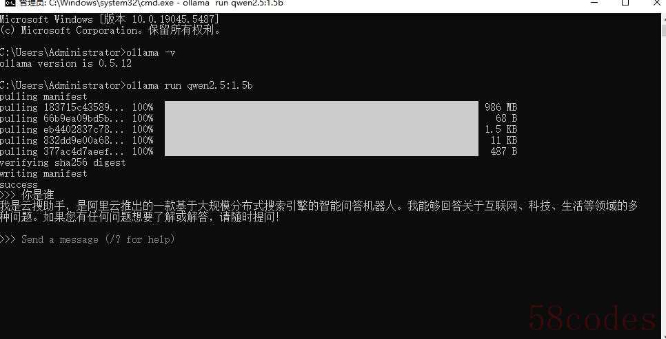 7、下载完成后会显示success,输入中文可以对话,按Ctrl+d退出对话,输入ollama list查看下载的模型,当然你下载的多显示的就多,到这里本地部署完成。