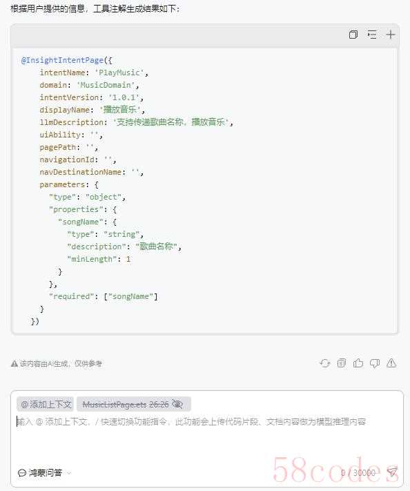 以下图中的一个生成播放指定音乐的意图装饰器为例,点击意图的页面意图子菜单,可在CodeGenie的对话窗口中输入提示词(可选),告诉小艺你想要生成的意图注解: