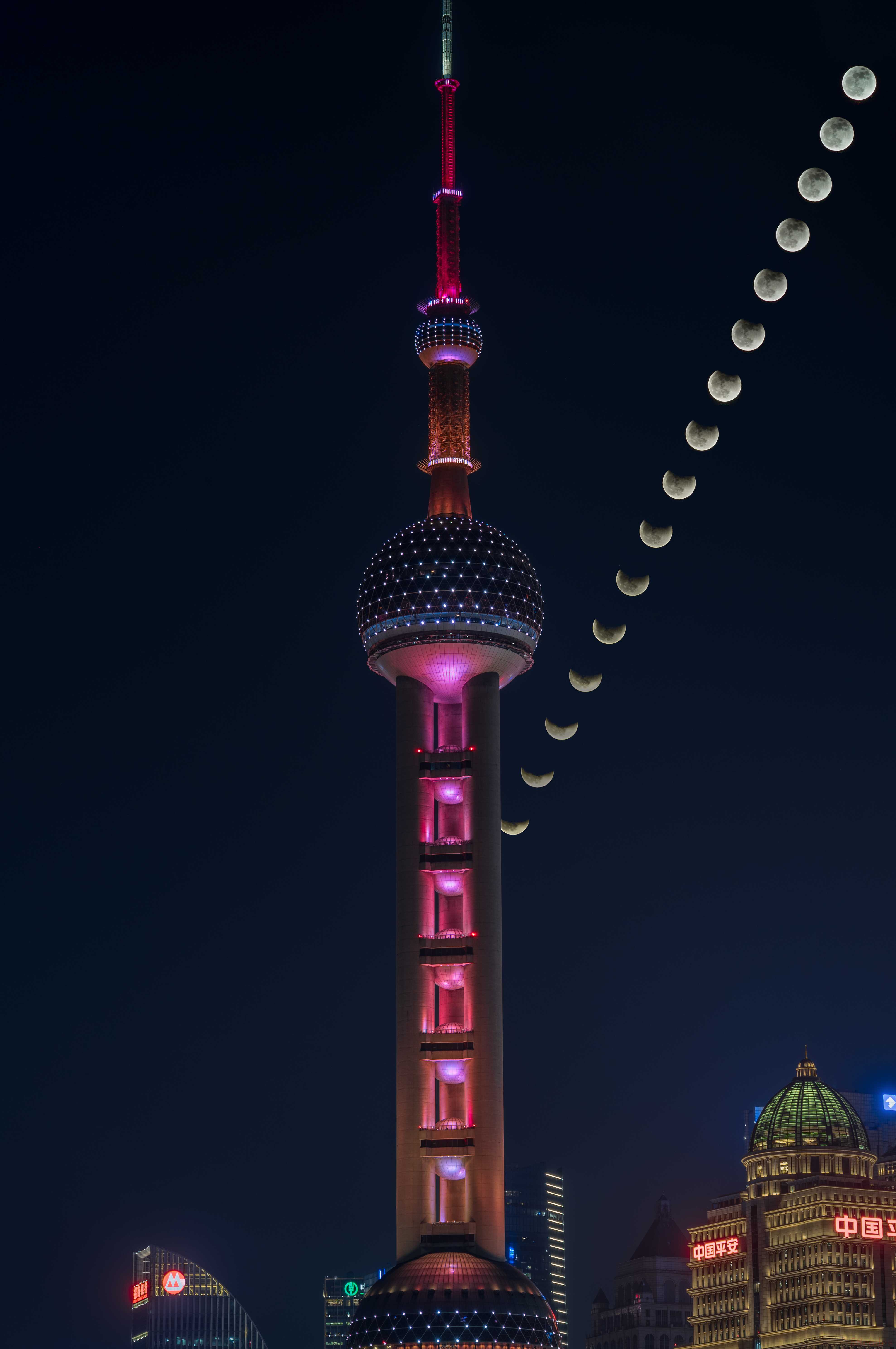 作品描述:上海近600年可见的最长月偏食过程。颗颗月食与东方明珠形成了有趣的呼应。