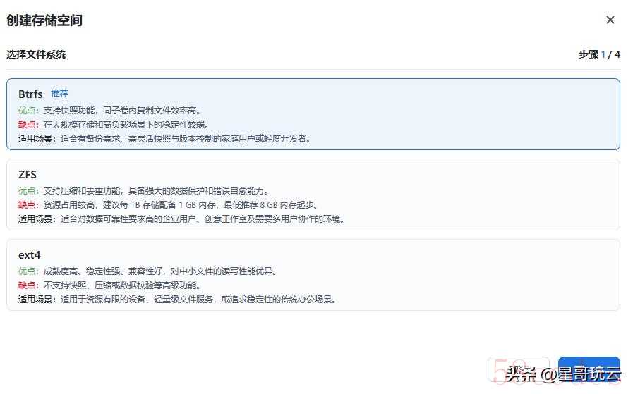 - • 家庭/轻量 NAS → 选 Btrfs,功能丰富(快照、压缩、校验),适合灵活管理。