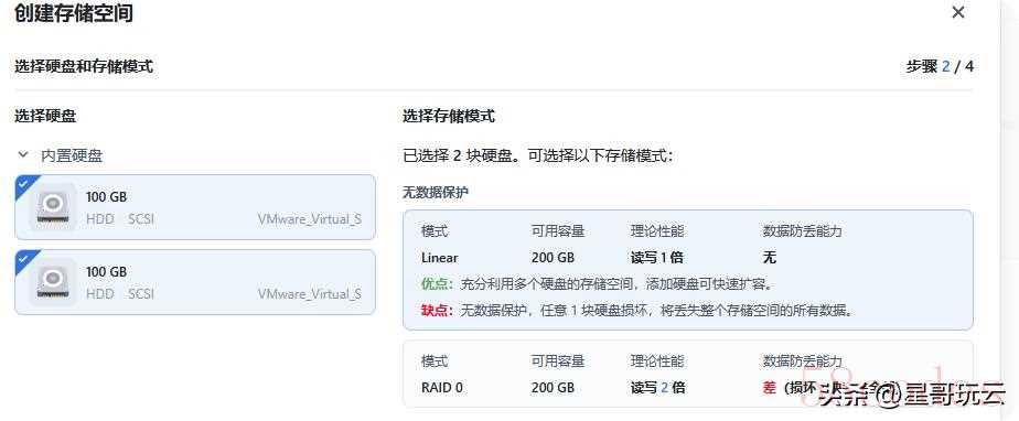 这里两块硬盘可以选择 Linear 、RAID0、RAID1