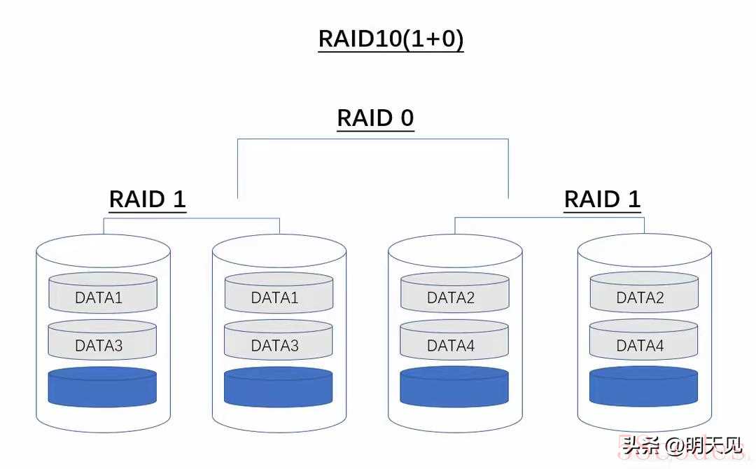 RAID 10 是将 RAID 1(镜像)与 RAID 0(条带化)结合的高性能高冗余阵列。