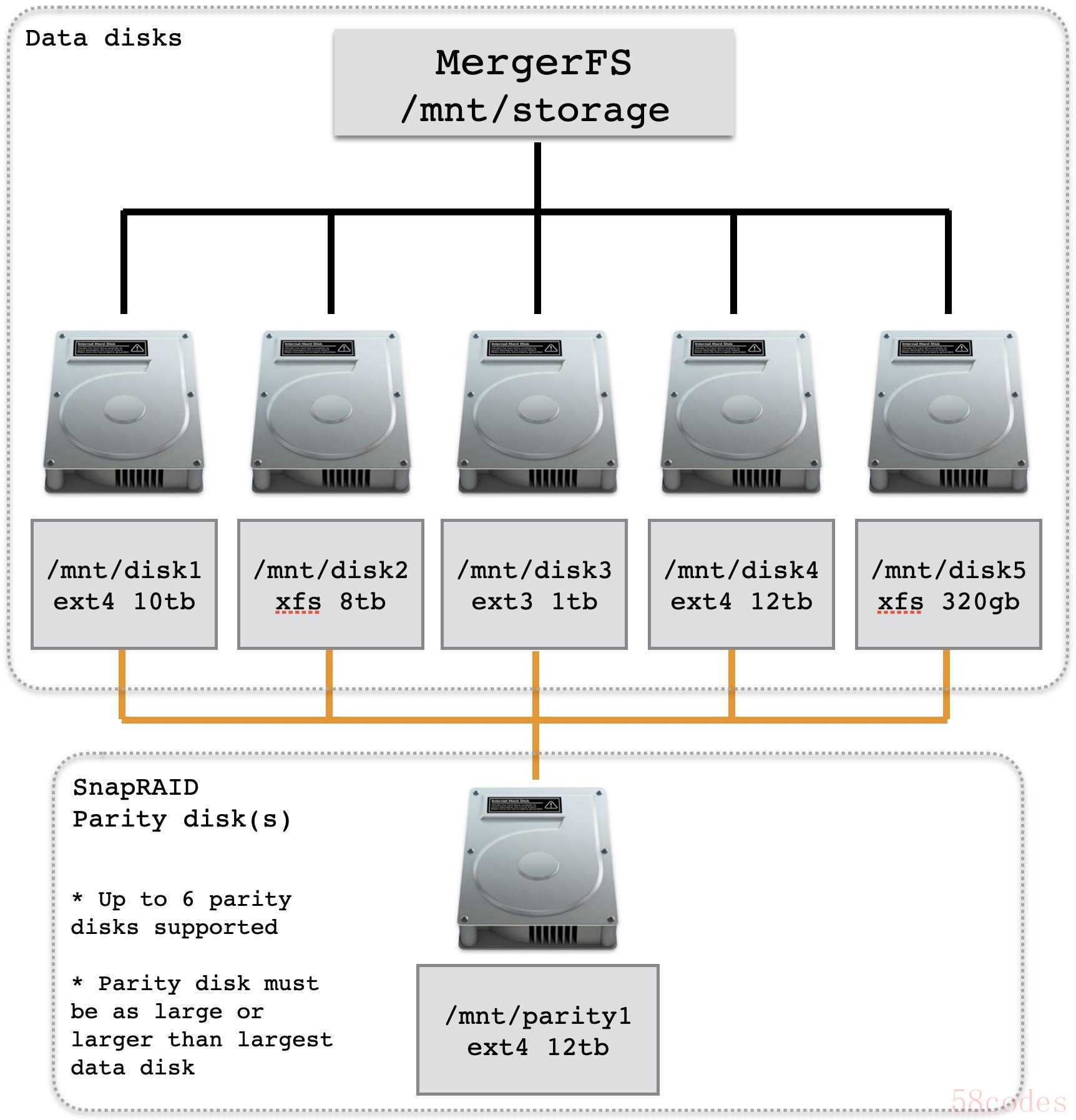 SnapRAID是通过配置检验盘来对抗存储池硬盘损坏,比如SnapRAID配置两块硬盘则可以实现类似于raid6的功能,存储池坏掉两块硬盘的情况下,存储池内所有数据不受影响。而在损坏3块盘时,raid6所有数据都没了,MergerFS+SnapRAID的组合则只会丢失坏掉的那3块硬盘上的数据,其他硬盘上的数据不受影响。