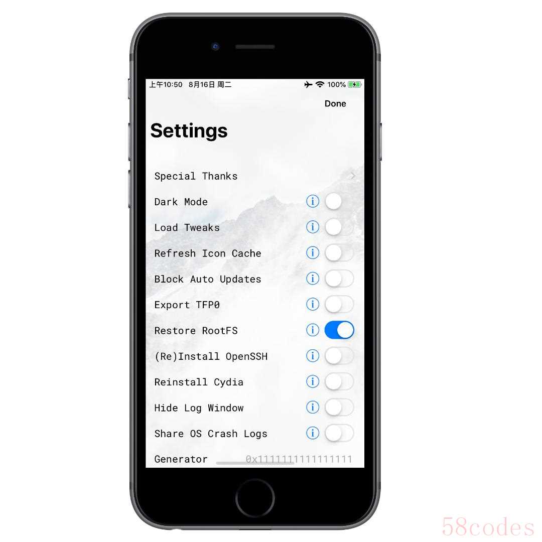 - 点击图二的Restore RootFS,等待重启即可清除越狱,再来一遍越狱操作,大概率成功。