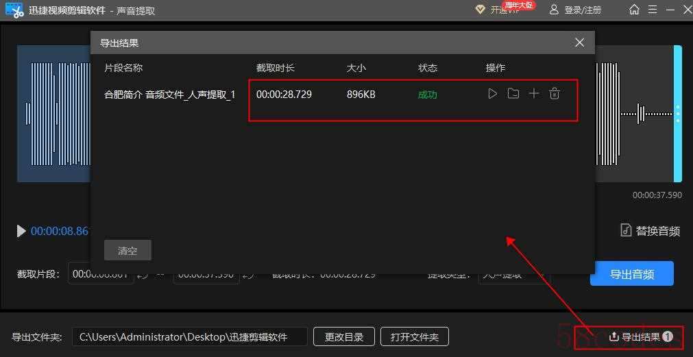 确定好后点击“导入音频”,在“导出结果”进行查看,待状态栏显示“成功”即可对提取后的文件进行播放、文件夹查看、加入剪辑素材和删除操作。