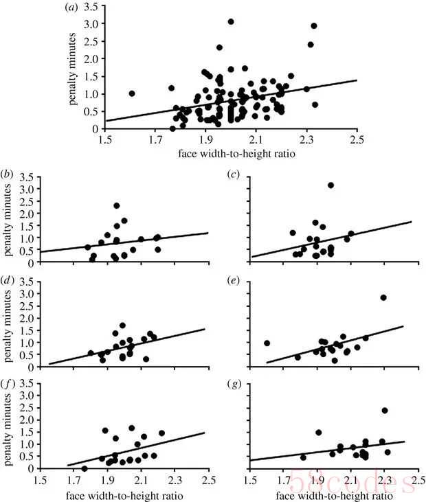 六支加拿大球队的男性职业曲棍球运动员的面部宽高比和攻击性行为之间的关系: (a) 总体分析,b-g单独球队分析