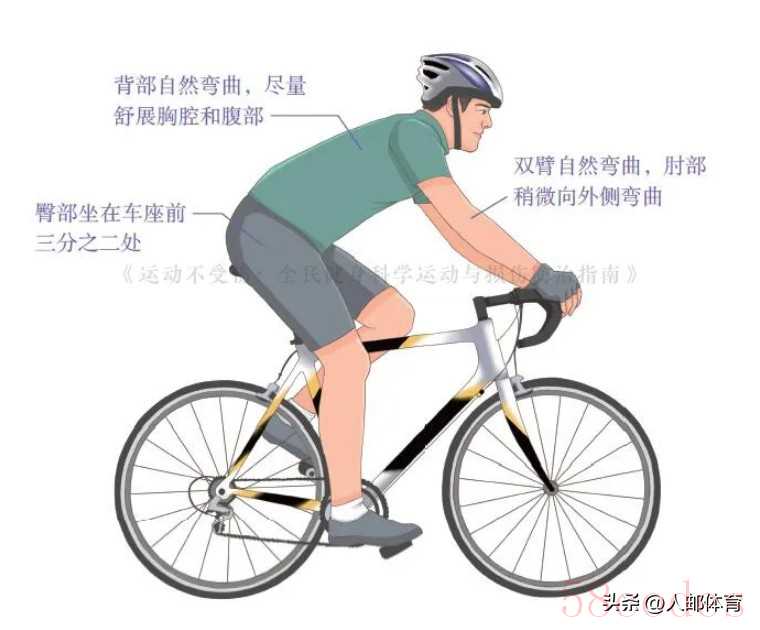 骑行的正确姿势骑行的正确姿势如上图所示,包括以下几个方面:全身放松,背部自然弯曲,尽量舒展胸腔和腹部,这样有利于呼吸;双臂自然弯曲,肘部稍微向外侧弯曲;臀部坐在车座前三分之二处,这样可以减轻臀部的压力,使骑行更舒适。