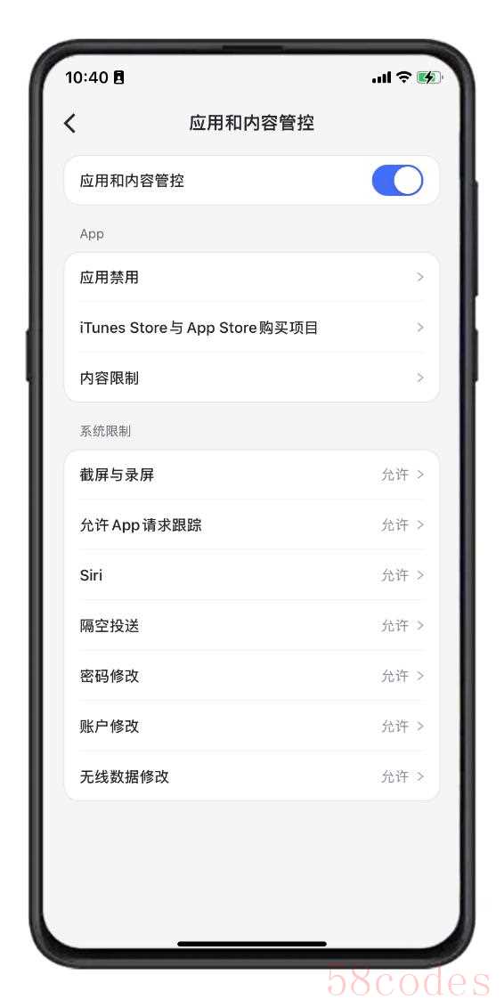 禁止孩子随意更改苹果账号和密码:点击【应用和内容管控】,将密码修改和账户修改为【不允许】即可。