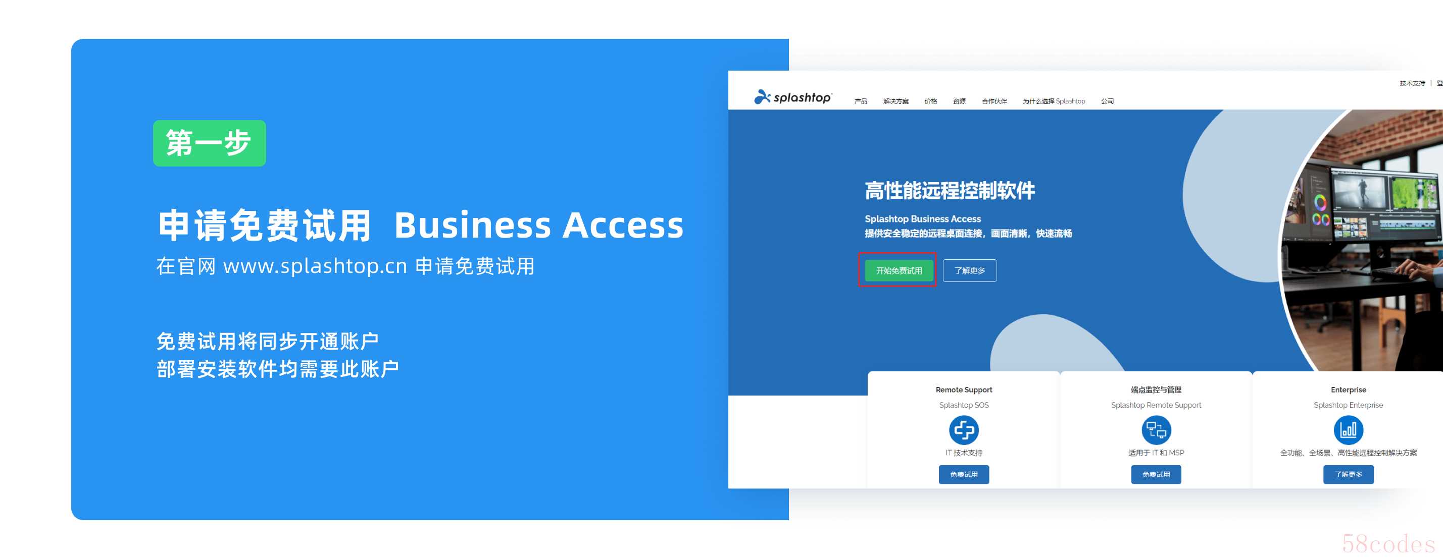 打开官网(https://www.splashtop.cn/),点击“开始免费试用”,进行账号注册。这里我们选择试用 Splashtop Business Access 即可。