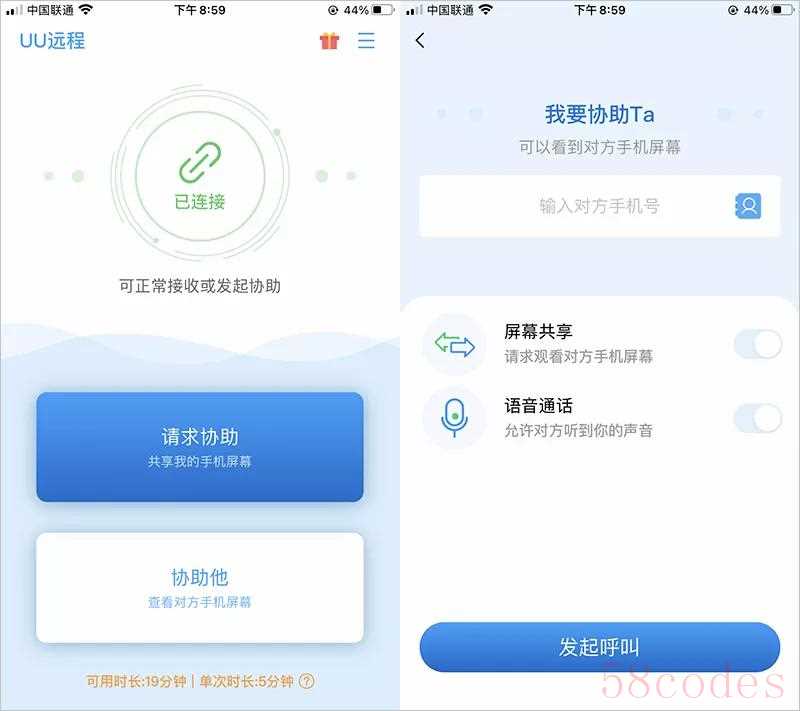 然后你可以选择 "请求协助" 或者 "协助他",输入对方注册账号的手机号码,发起呼叫连接。