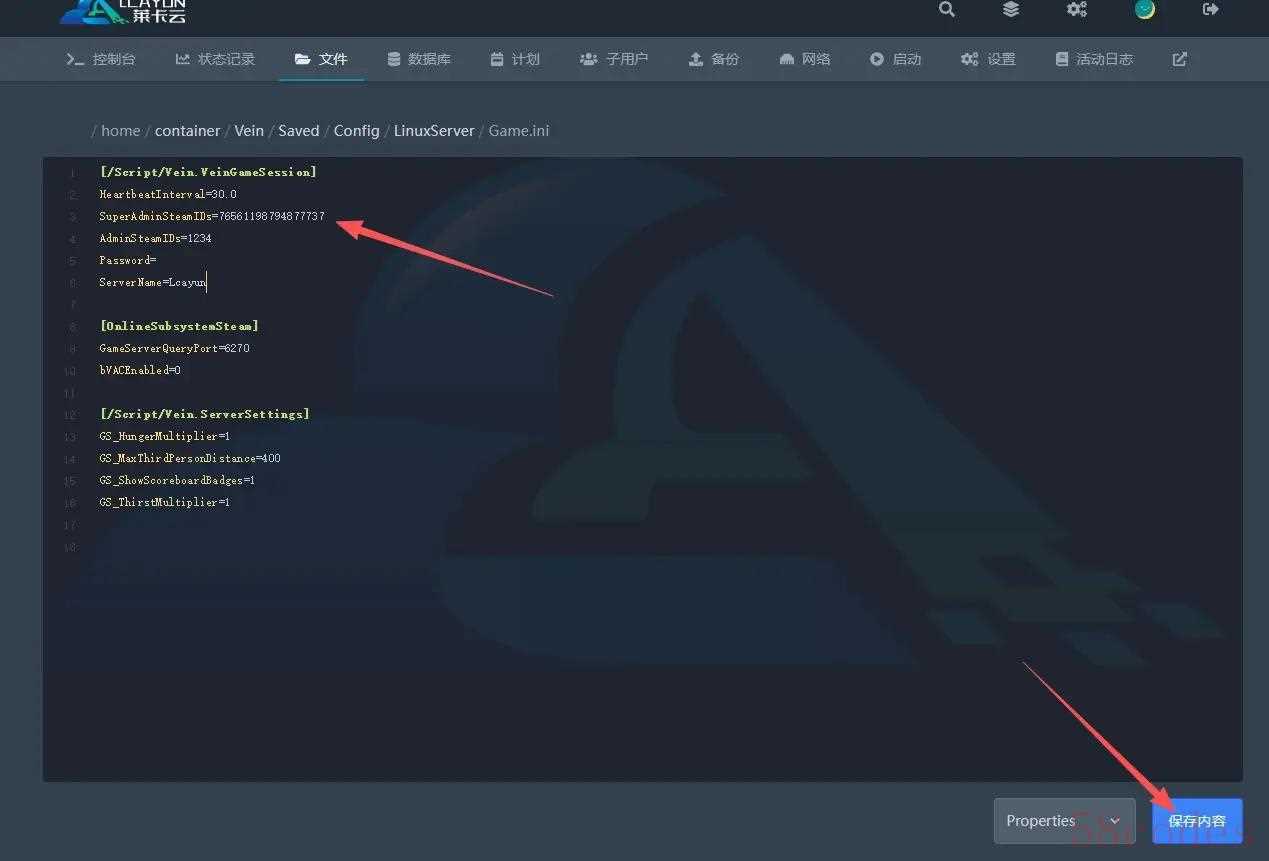 根据你的需求去添加管理员,例如你想给一位玩家设置超级管理员,就在SuperAdminSteamIDs=写入他的steam64为ID【steam64为ID获取方法】