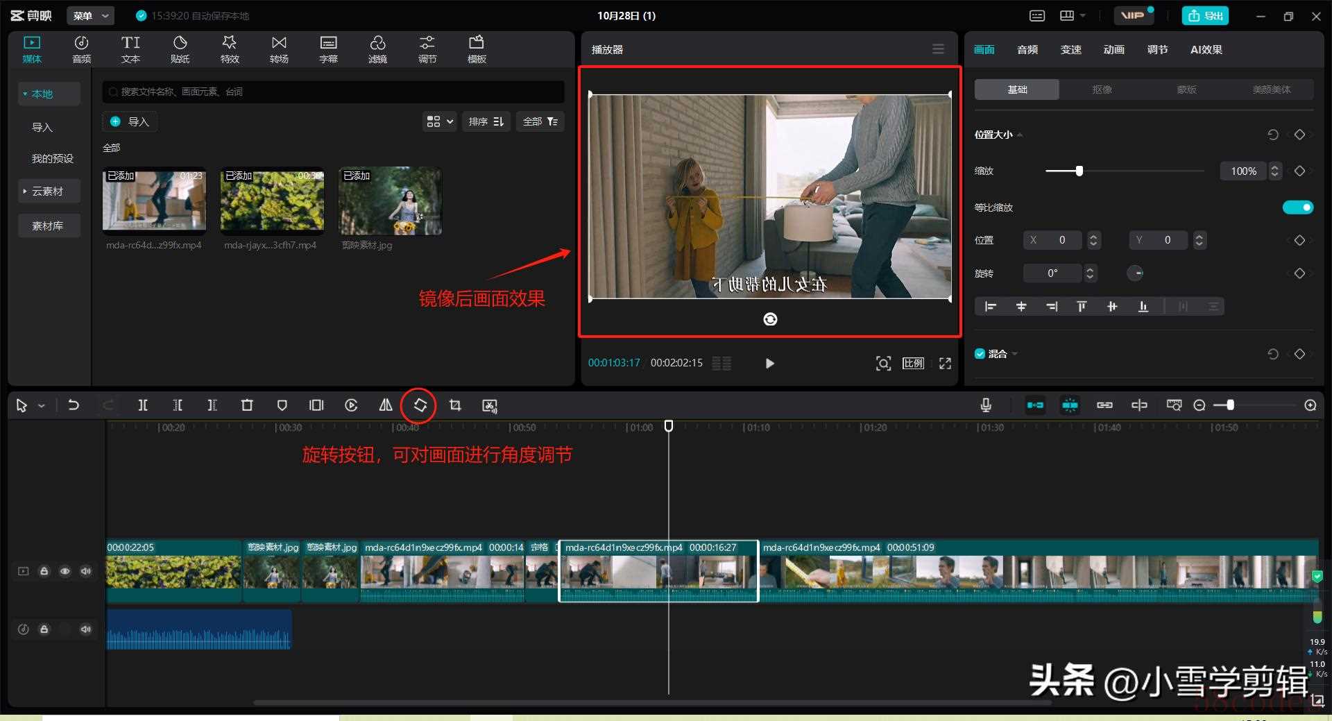 | 素材编辑 | 基础调整:缩放/移动/旋转 | 拖动四角圆点缩放、拖动画面移动、点击旋转按钮 | 选中时显示白色边框和操作点 |