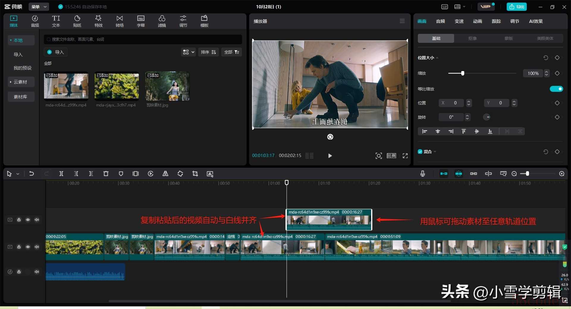 - 复制粘贴操作:使用快捷键Ctrl+C复制视频片段,Ctrl+V粘贴到轨道上,粘贴后的片段会自动与时间线对齐并移动到相邻轨道。