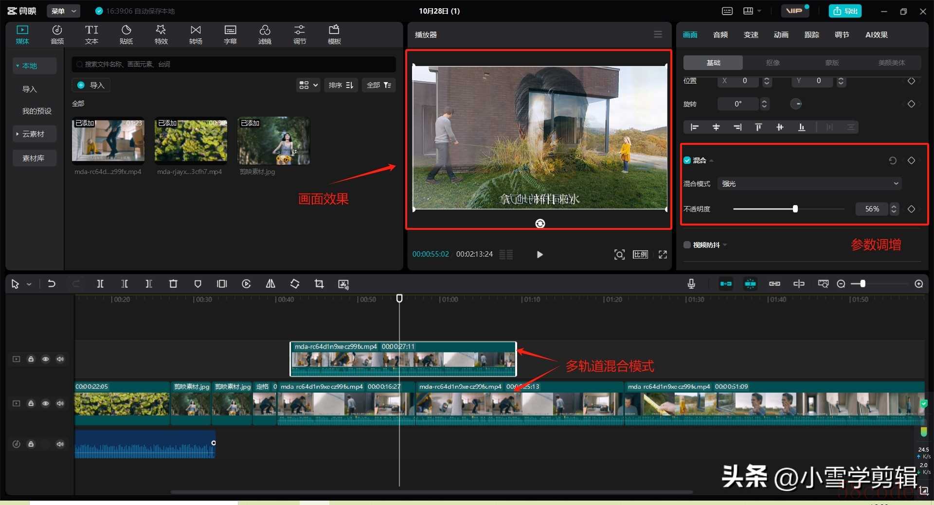| 混合模式 | 多轨道叠加效果设置 | 调节不透明度实现融合 | 需2个以上视频轨道 |