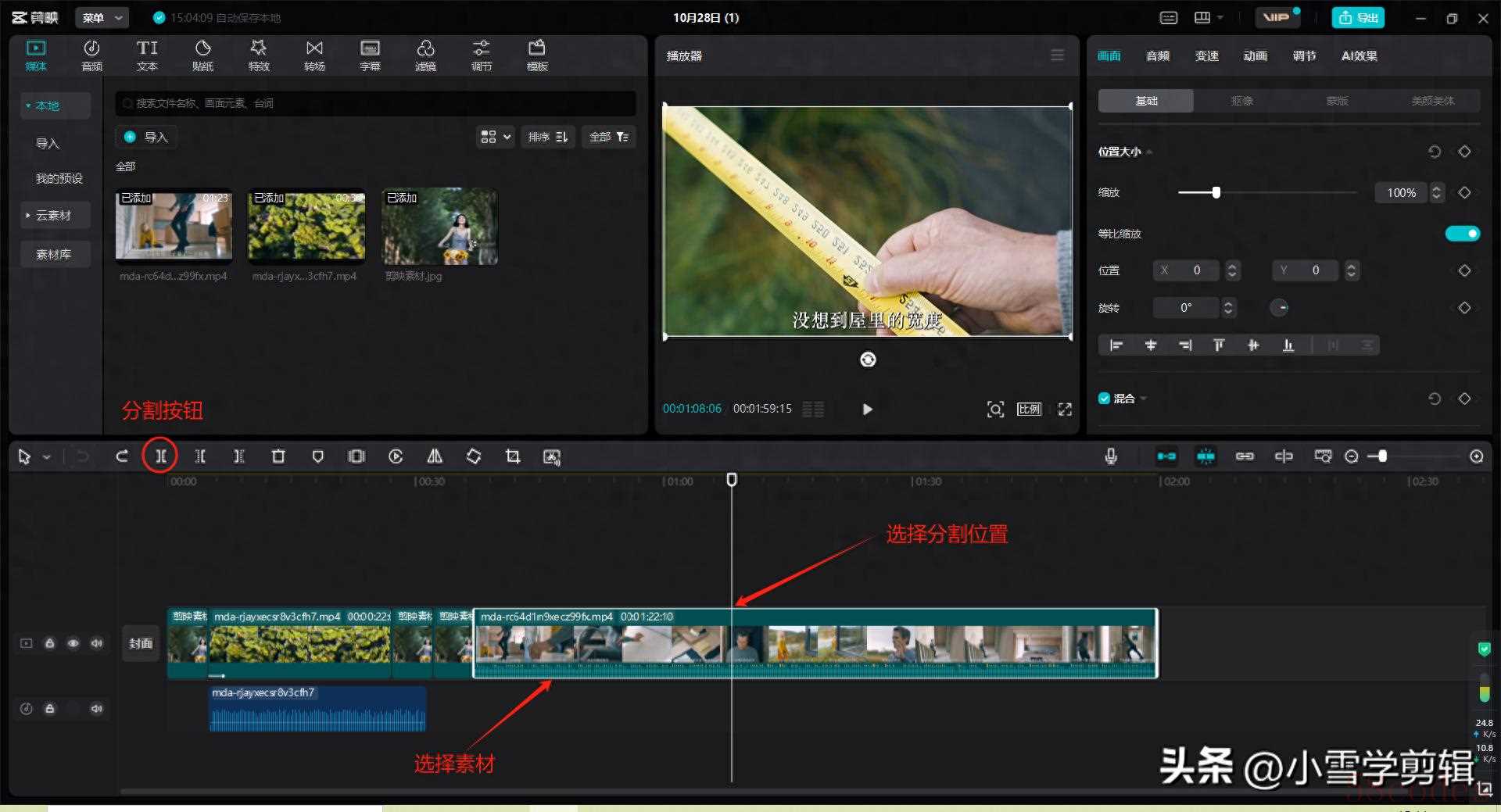 - 操作方法:选中要分割的视频片段,将时间线(白线)移动到需要分割的位置,点击分割工具即可完成分割或者直接使用快捷键(Ctrl+B),完成分割。