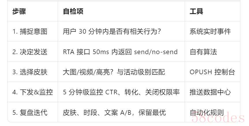 - RTA 推送:App 毫秒回传“要不要发”,系统 100ms 内完成展示,真正做到“意图→触达”同帧完成。