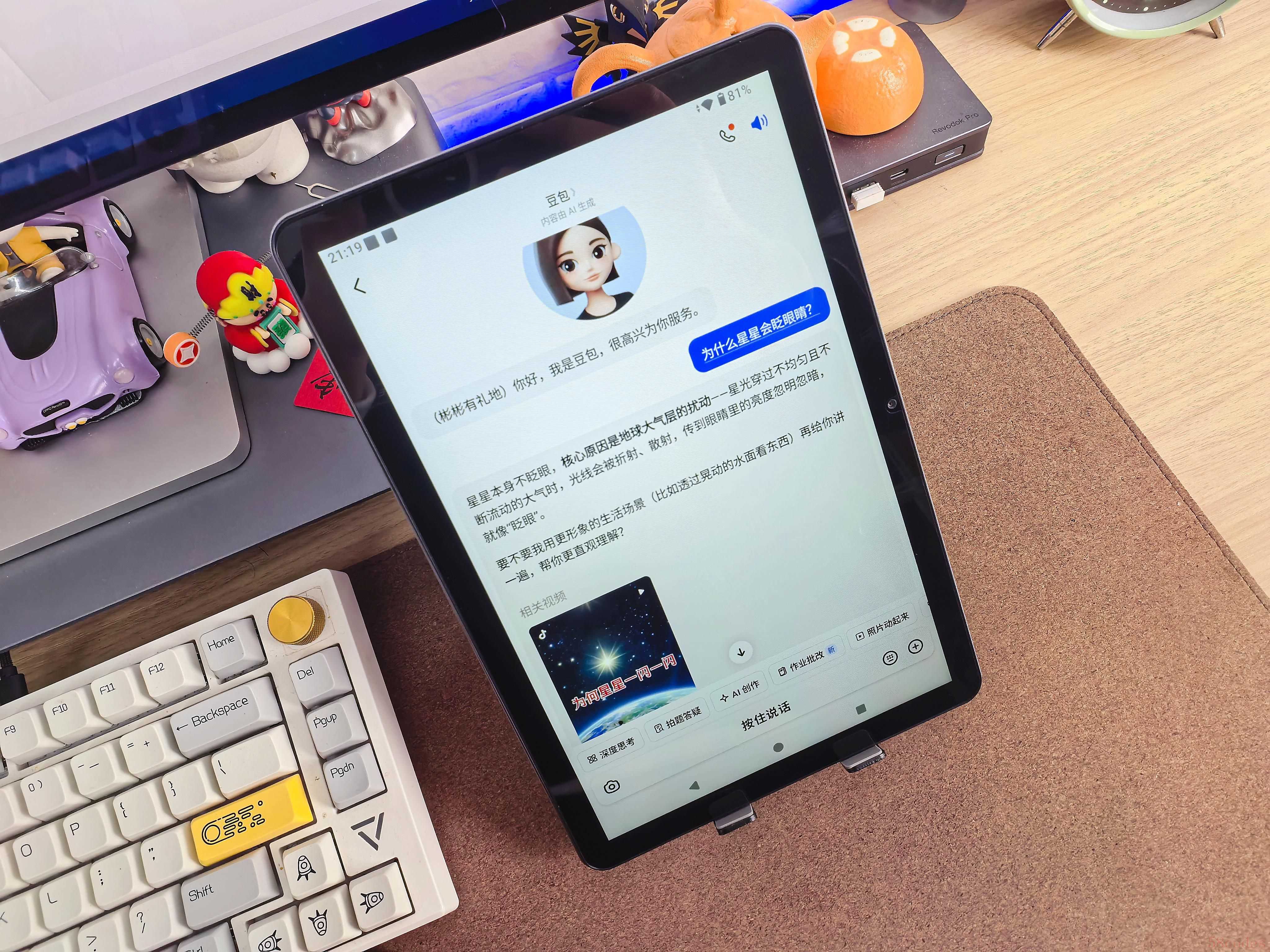 科技让生活更轻松,装上豆包AI后,平板瞬间升级成家里的“智慧大脑”。孩子问“为什么星星会眨眼?”、老爸问“明天要下雨吗?”、老婆问“红烧肉怎么做?”,现在他们不用打字,直接对着平板问一句,马上就能得到答案。这个交互简单到老人孩子零学习成本,真正实现了“动口不动手”。