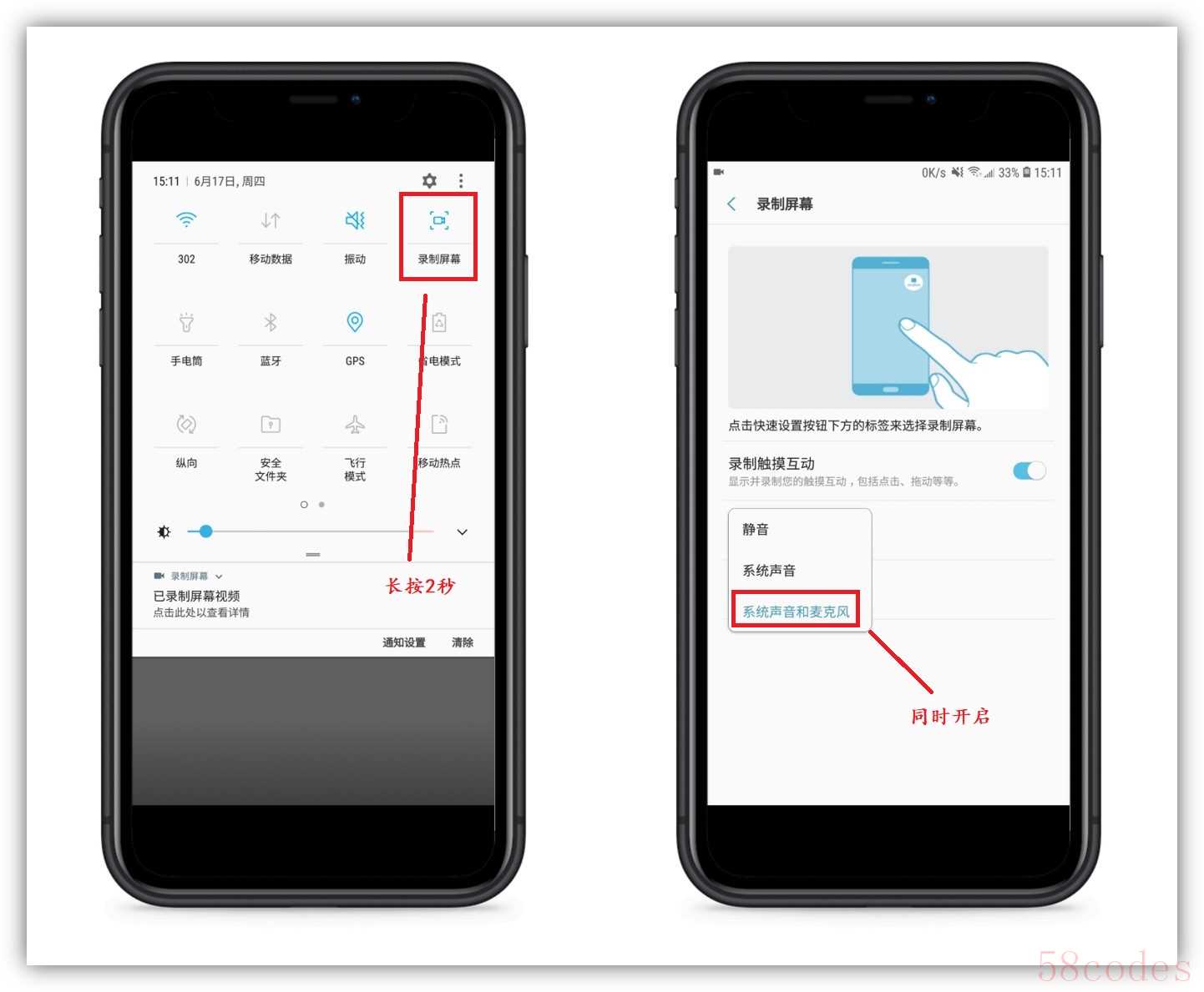 如果你用的是安卓手机,下滑通知栏就能找到录屏功能,长按打开设置,开启「系统声音和麦克风」,这样就可以录制外部声音了。