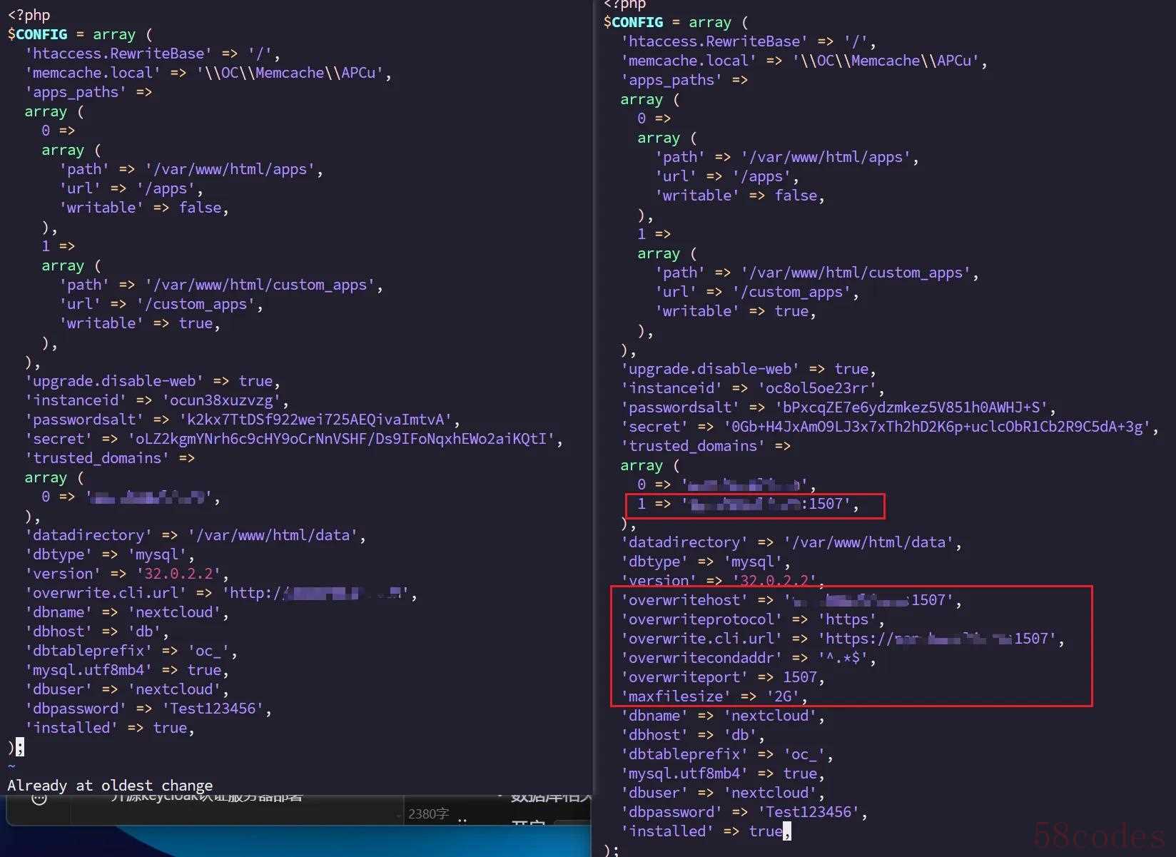 sudo vim /srv/nextcloud/www/html/config/config.php参考下面的示例配置,对关键字段进行调整(只要对照修改关键项即可,不一定要一模一样):