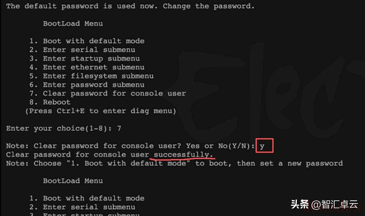 4.根据提示输入“Y”确认清除console口密码,看到“successfully”表示清除成功了。