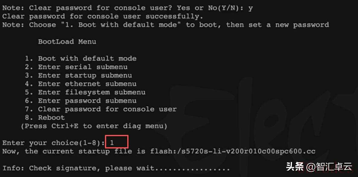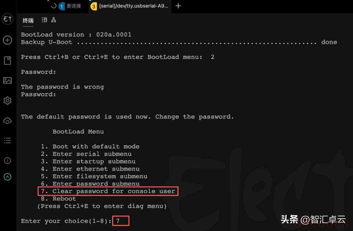 3.进入到BootLoad主菜单后,根据提示输入“7”清除console密码。