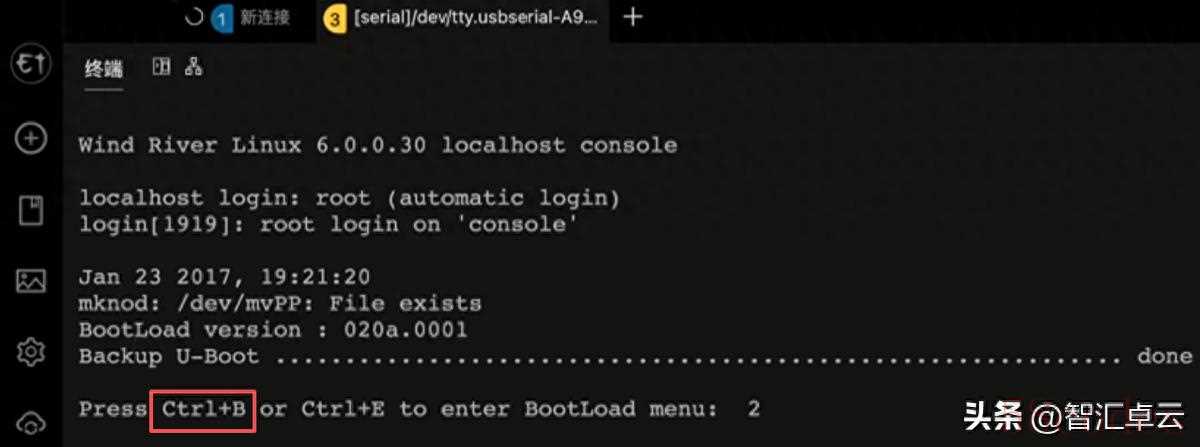 1.与之前重置防火墙时一样,准备一根Console线插到防火墙的Console口上,然后重启交换机。在设备启动过程中,看到提示信息“Press Ctrl+B or Ctrl+E to enter BootLoad menu:”时,在三秒内按下Ctrl+B或者Ctrl+E进入到BootLoad。