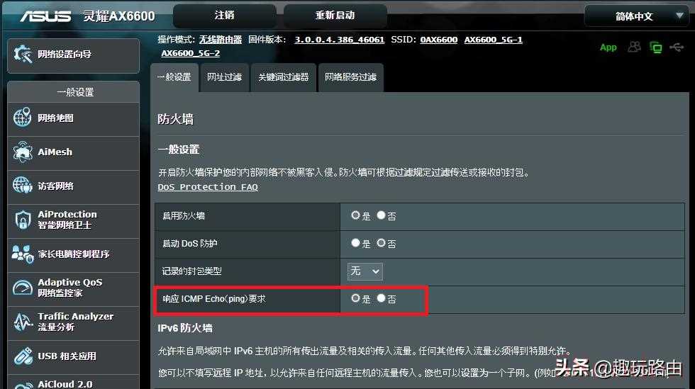 到这里使用IPv6地址注册华硕DDNS已经完全OK了,此时我们再进入防火墙页面开启响应ICMP Echo(ping)要求。