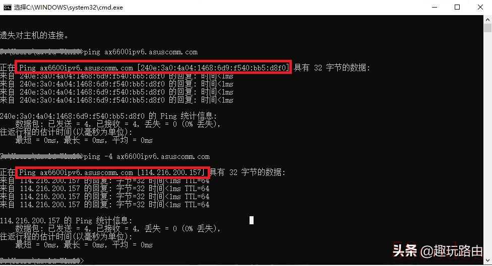 然后互联网上一台具有IPv4与IPv6地址的PC(皆可以访问互联网),ping 上面注册的DDNS名称,ping ax6600ipv6.asuscomm.com,检查ping回应得到的IPv4与IPv6地址是否与AX6600中的一致,如下图,这里确认是否一致的。