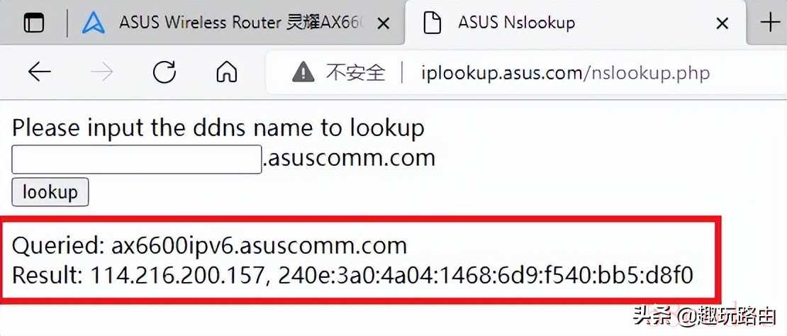 http://iplookup.asus.com/nslookup.php 进入页面输入注册的主机名称,点击lookup,然后Result中会出现路由器互联网IPv4与IPv6地址,如下图:
