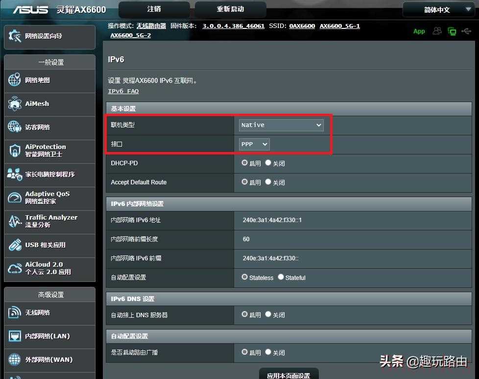 进入IPv6页面设置连接类型:Native,接口:PPP,如下图