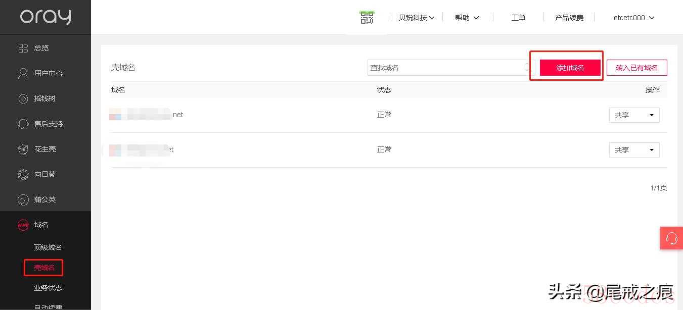 3、登录以后,选择左侧菜单“域名-壳域名”,然后点击“添加域名”,进入域名申请界面