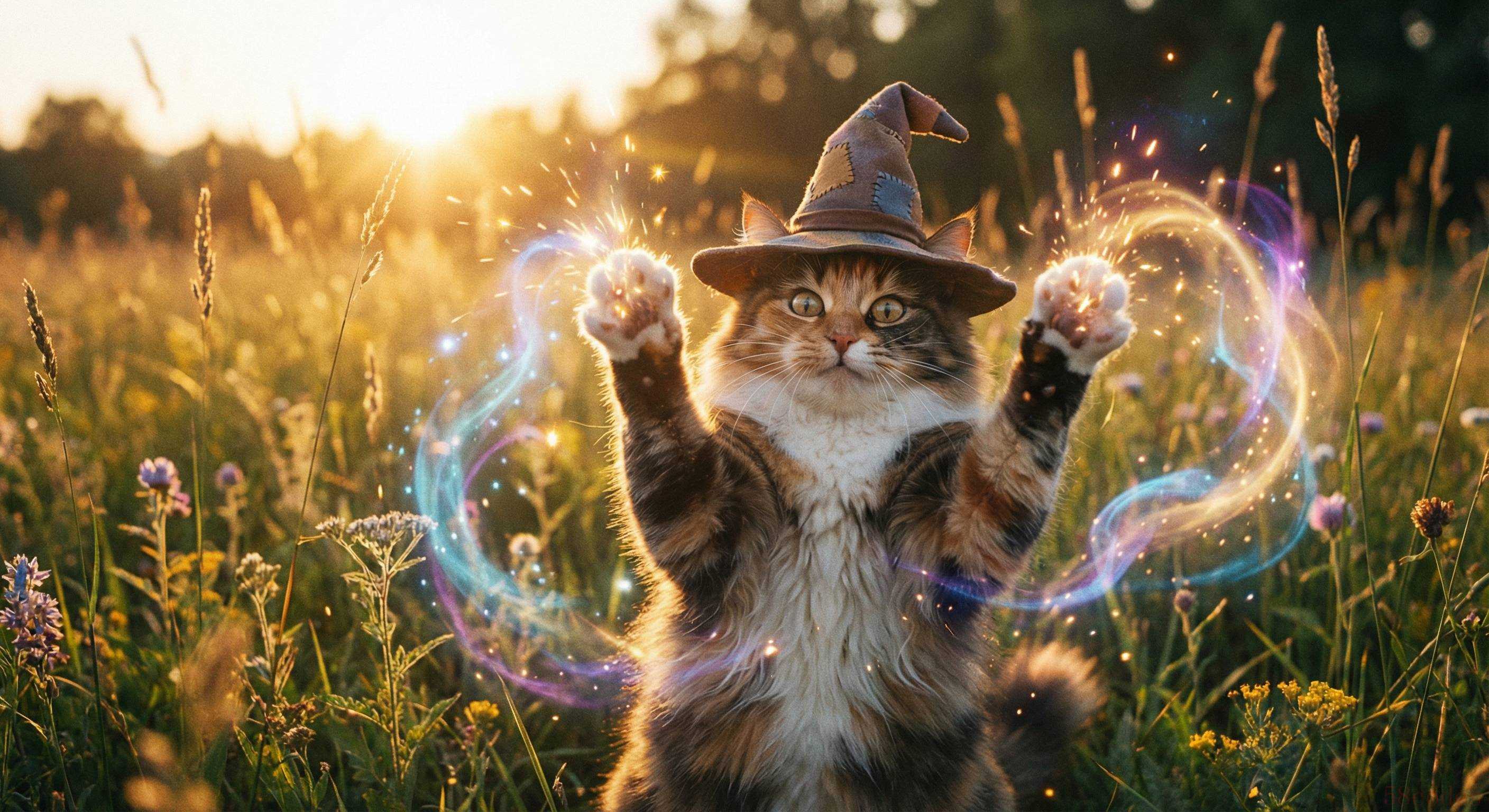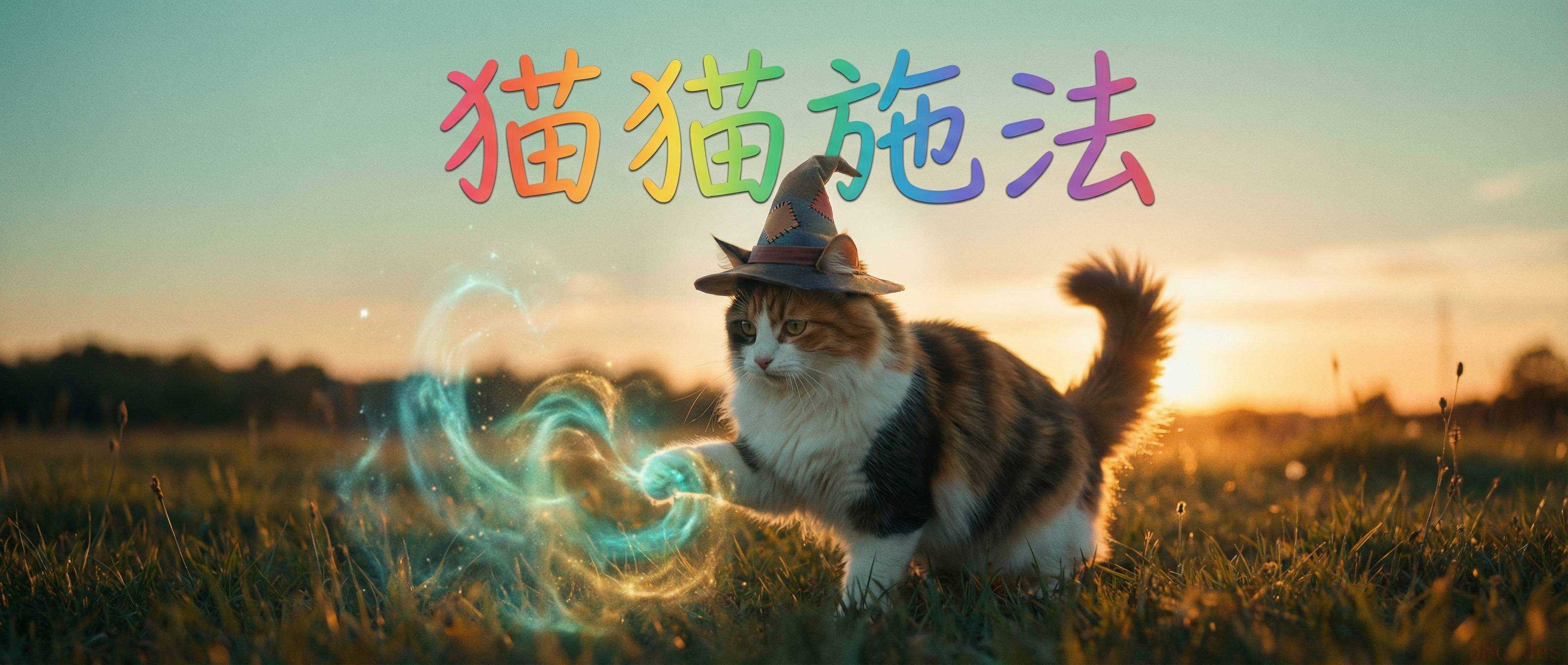 举例:一只戴着小巫师帽的毛茸茸的三色猫,在日落时分阳光普照的草地上,施展着它的魔法,低角度镜头,浅景深(f/1.8)、黄金时段逆光营造长阴影、电影级调色,采用柔和的蓝绿色调。照片写实主义。21:9 电影宽镜头。标题「猫猫施法」以可爱的彩虹字体显示在顶部。
