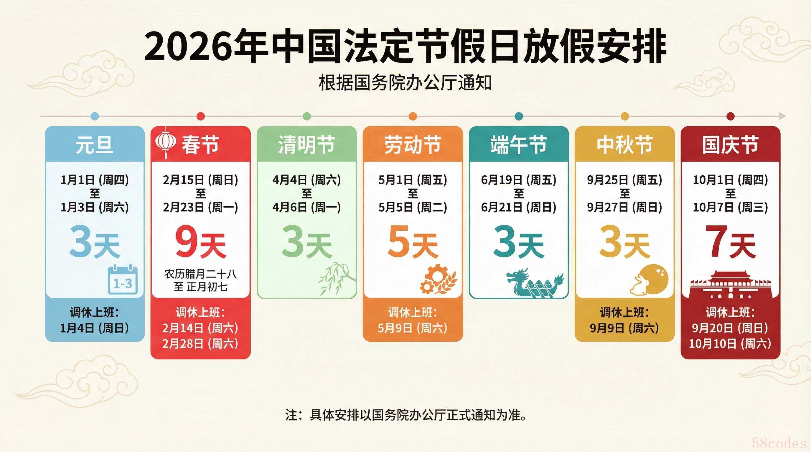 提示词:生成一张 2026 年中国放假安排的信息图,全部使用中文,4K画质,16:9