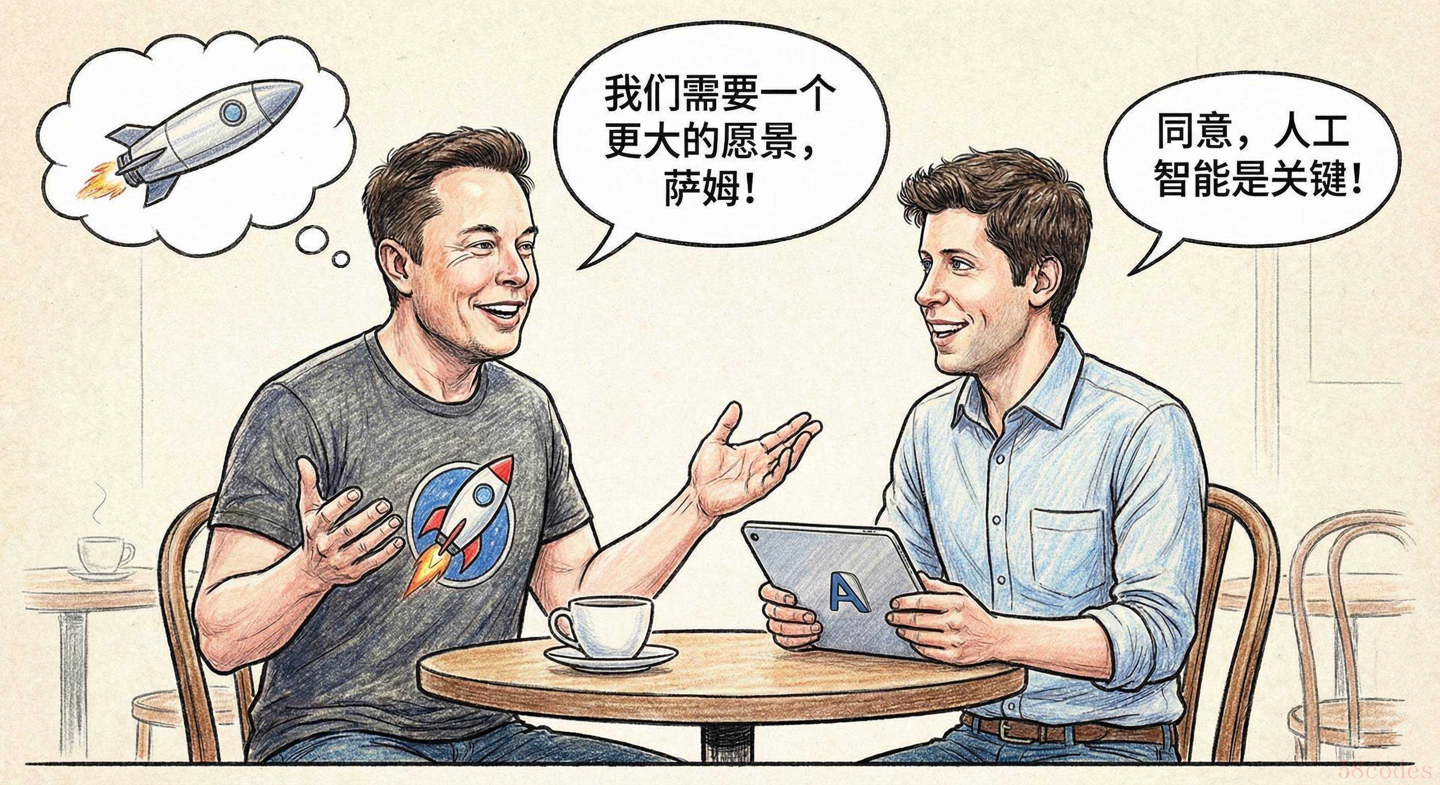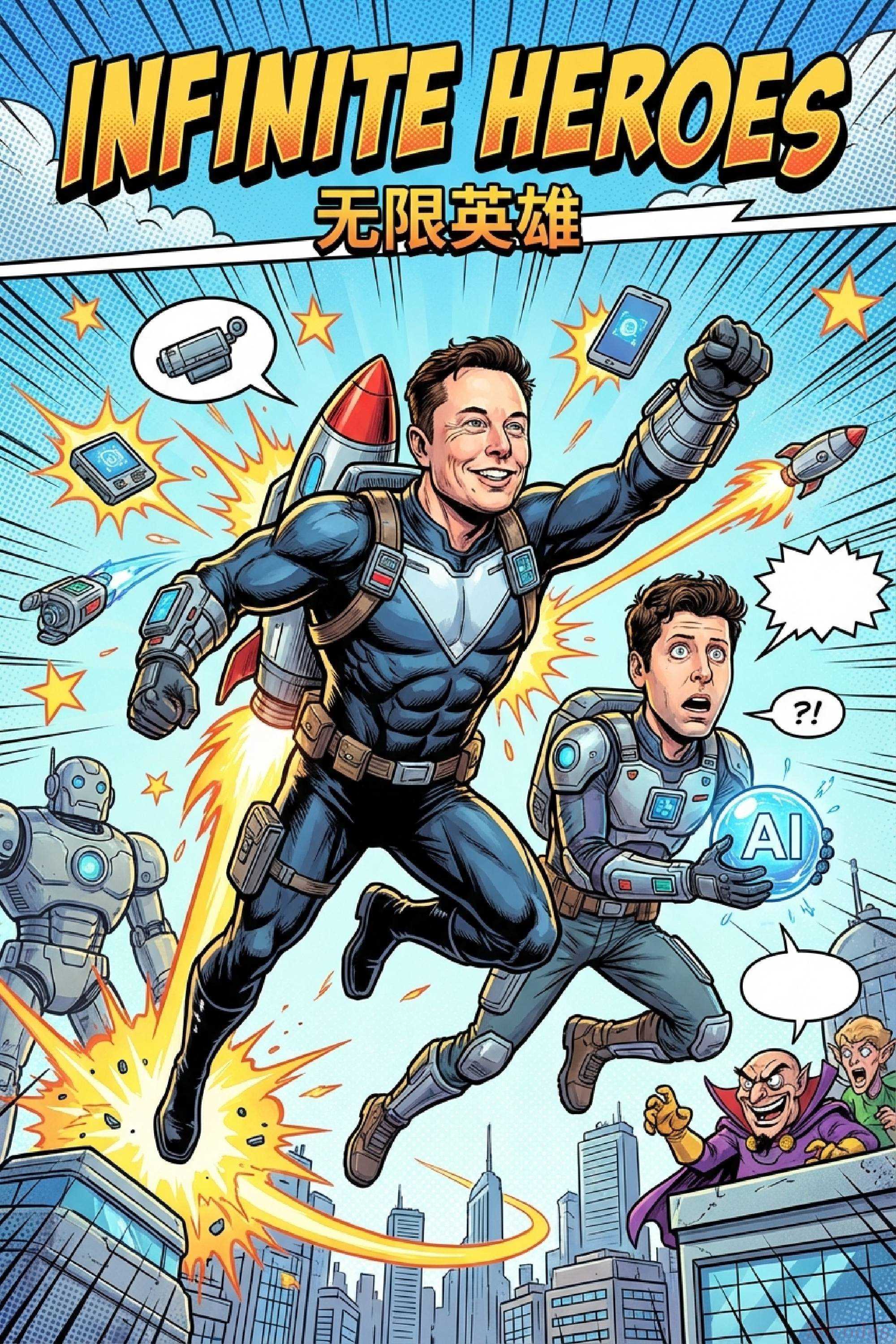 提示词:生成几张以 Elon Musk 和 Sam Altman 的生活为主角的真人漫画图片,全部用中文