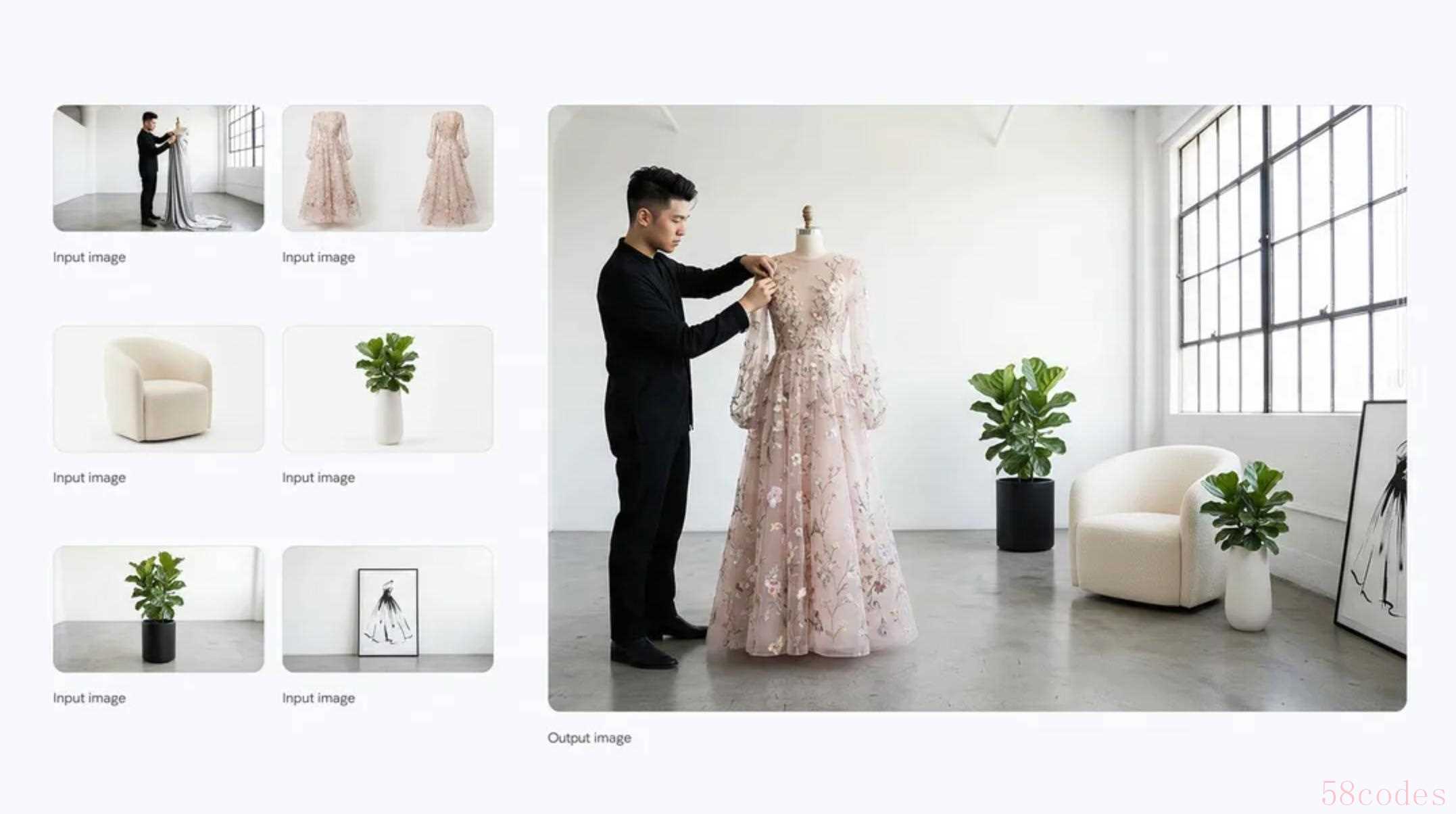 3、最多支持 14 张图!超级融合大法。这大概是新模型最强悍的功能之一。它允许我们输入 6 到 14 张(具体数量可以要看不同的平台)完全不相关的图片,让 AI 将它们融合创造出全新的画面。