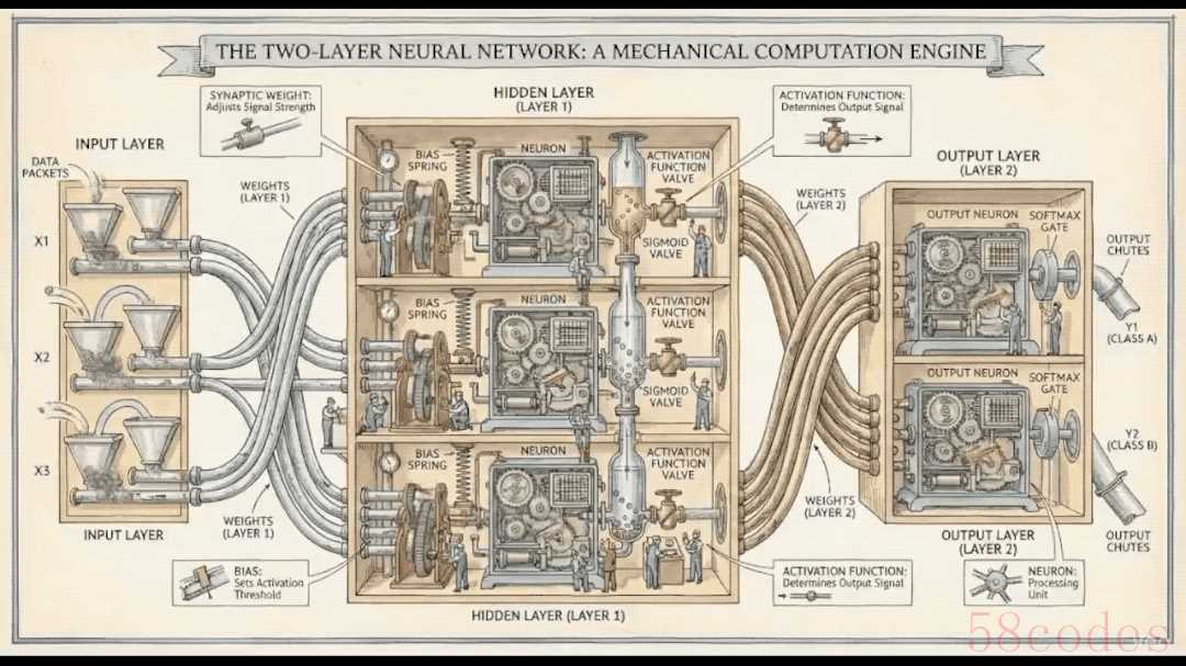 图片来源:X@jon_barron|提示词:Generate a diagram of a two-layer neural network in the style of Stephen Biesty
