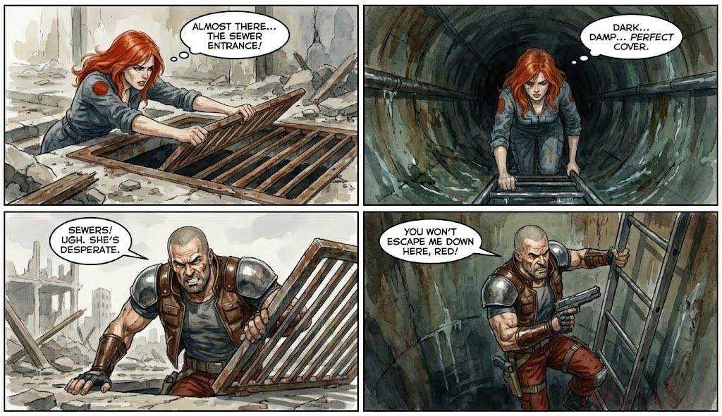 图片来源:X@DeryaTR_|提示词:Create and draw a multi-panel comic based on this image.