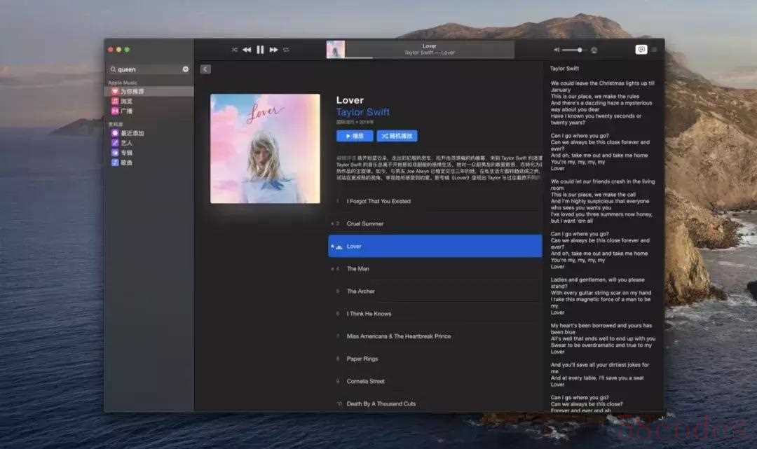 不过,在使用过程中,还是有一个小遗憾。在移动端,歌词是可以用非常优雅的方式滚动播放的,但在 Mac 的音乐中,依然是简单的文本。所以,如果后续能够设计一个类似更加优雅的歌词显示方式会更好。至于播客,逻辑完全和音乐一致,两者的界面关系基本上如出一辙。