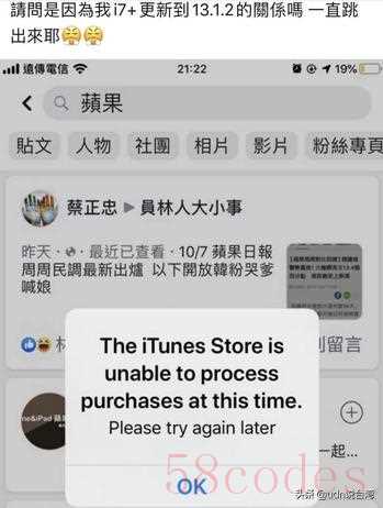 iPhone作业系统iOS目前更新至13.1.2版,有网友更新至最新版后,手机不断跳出“The iTunes Store现在无法完成购买”,而且讯息无法关闭,遂到脸书社团回报灾情,结果发现许多人也碰上类似问题。