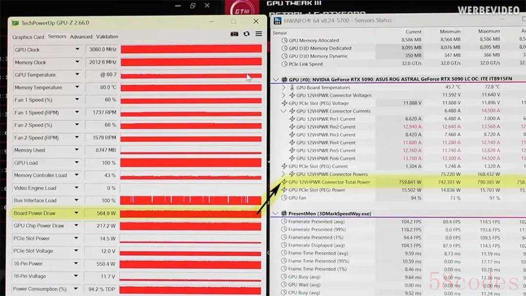 Der8auer 还借助 WireView 来监测真实功耗。而对于 Astral 系列显卡,其 16 针电源接口还具备引脚传感功能,这提供了另一种实时监控输入功耗的途径,该功能仍将保持实用价值。