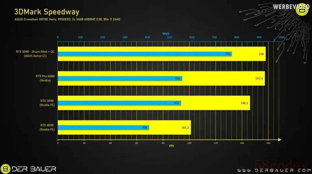 经改装后,显卡的功耗从原来的 660 瓦增加到 720 瓦,GPU 频率提升至 2,950MHz,性能也有所提升。FPS 从原来的 146 帧提高到 152 帧,成功超越了售价 10,000 美元的 RTX Pro 6000 显卡。