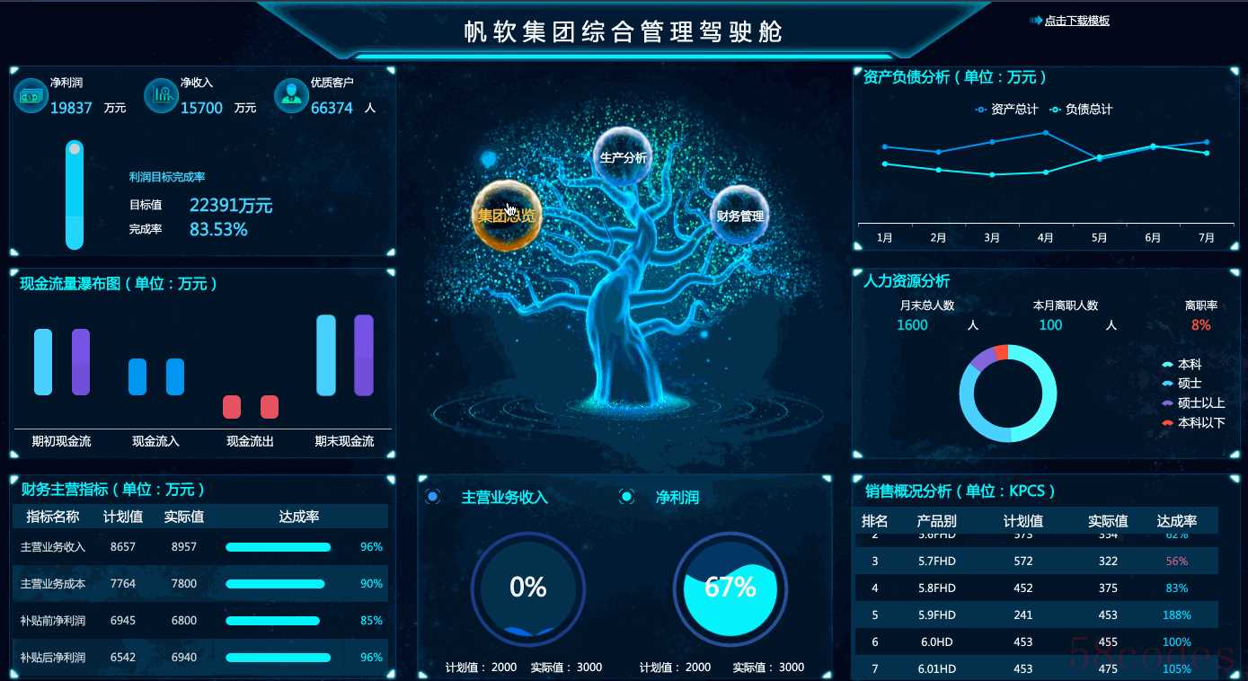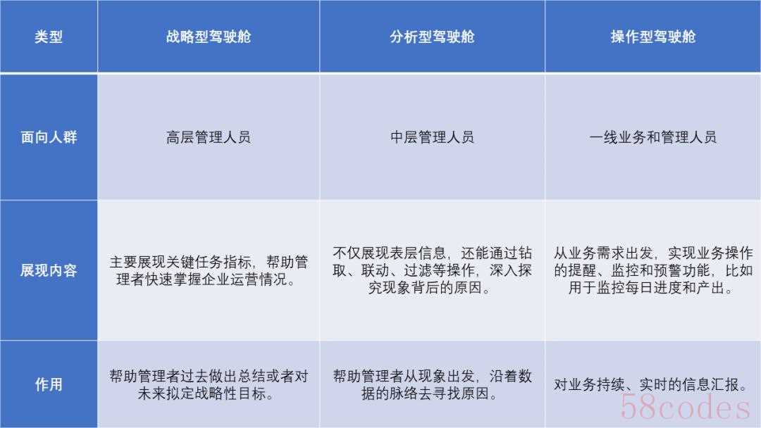 第一种是战略型驾驶舱,主要是让高层管理者看的。这些人负责整个公司层面的战略制定,基本上没时间也不需要去了解细枝末节的东西,只要根据关键指标的变化情况,制定合理的策略,让公司长时间处于增长状态就可以了。