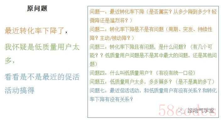 注意,只有经过专业训练的人,才能用这五句描述问题。大部分人都是混合在一起吐出来的。比如领导说:“最近转化率下降了,我怀疑是低质量用户太多,看看是不是最近的促活活动搞的”,这里看似是一个问题,可拆解一下,其实隐藏了一堆问题(如下图)。
