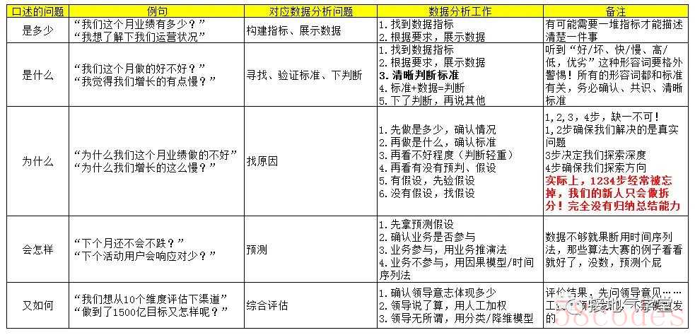 你问我答型报告,最大的坑点在于问题本身。高质量的问题,带来高质量的答案;低质量的问题,把分析带沟里。提问是否清晰准确,是混职场的核心能力(有之一)。专门讲内容太多,这里聚焦数据分析问题,大家记得这五个基本问题(如下图).