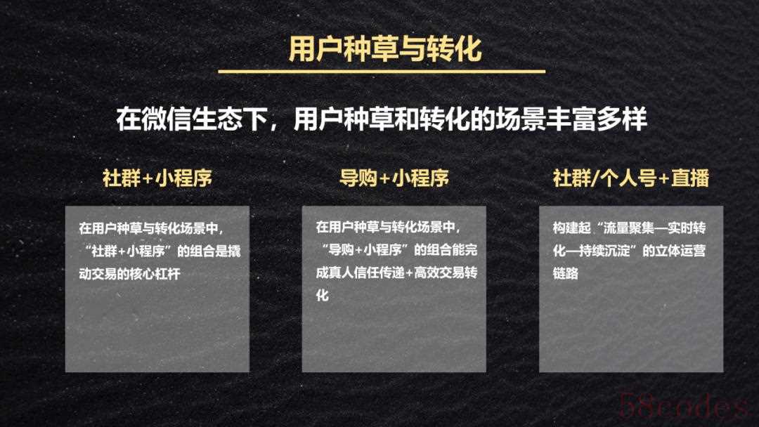 在微信生态下,用户种草和转化的场景丰富多样,其中“社群+小程序”、“导购+小程序”、“社群/个人号+直播”是三种尤为重要的模式。当然,你还可以延伸出“公众号+视频号”、“公众号+小程序”、“导购+视频号”的排列组合。以下是对我刚才提到的三种主要场景的具体分析。