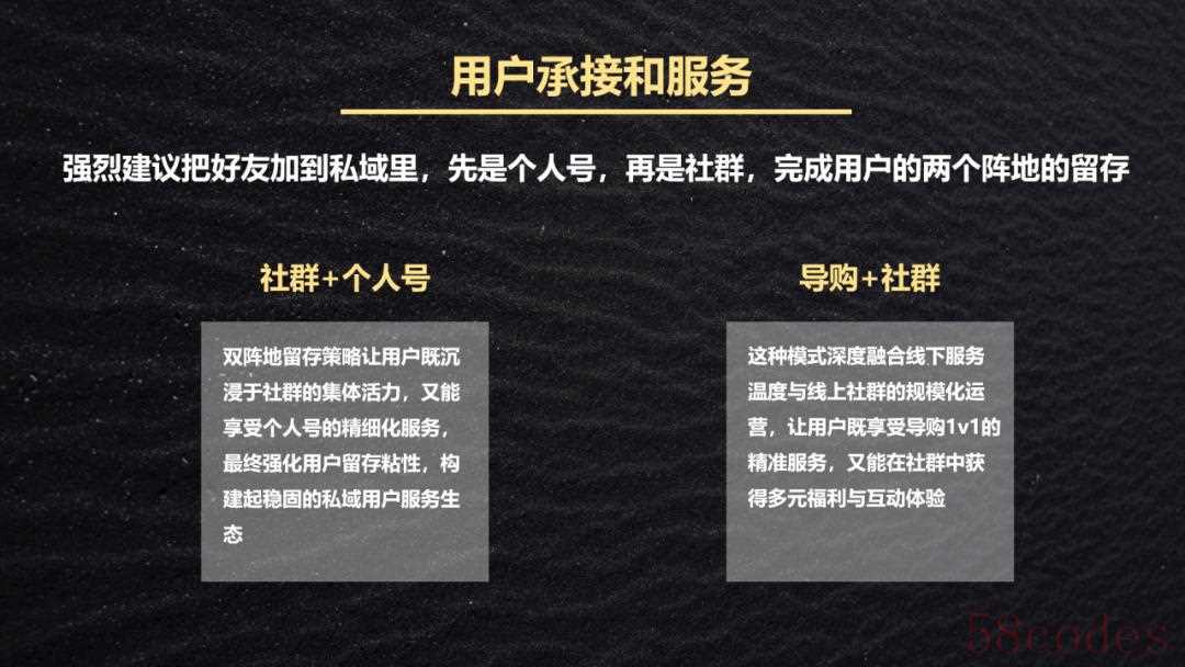 用户承接有多种方式,在这里,我列举我常用的两种承接方式,第一种是社群+个人号,第二种是导购+社群。我会强烈建议把好友加到私域里,先是个人号,再是社群,完成用户的两个阵地的留存。你可以在脑中构思链路,同样也可以看完文章后,立即将自己的业务做调整。