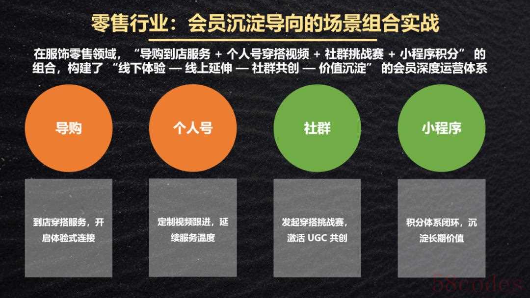 在服饰零售领域,“导购到店服务 + 个人号穿搭视频 + 社群挑战赛 + 小程序积分” 的组合,构建了 “线下体验 — 线上延伸 — 社群共创 — 价值沉淀” 的会员深度运营体系。
